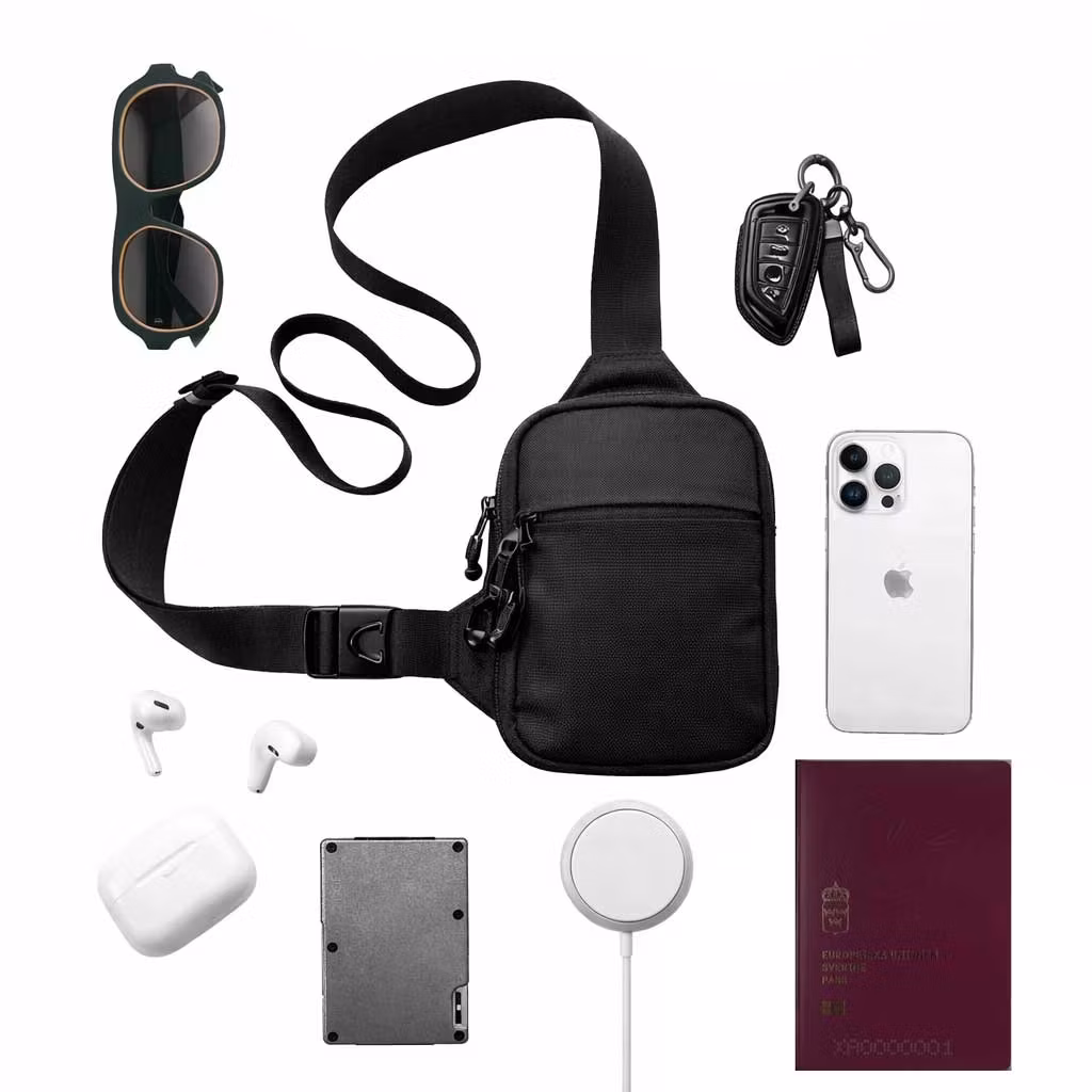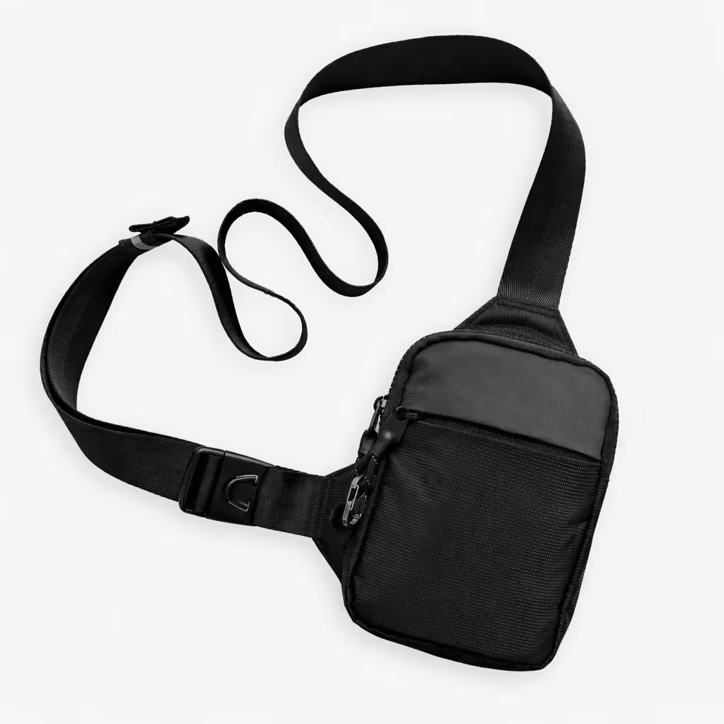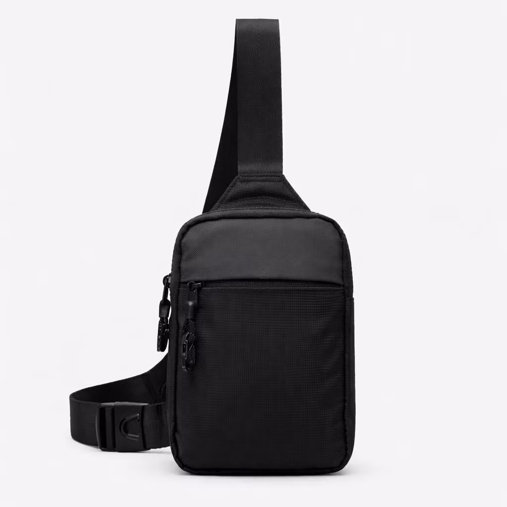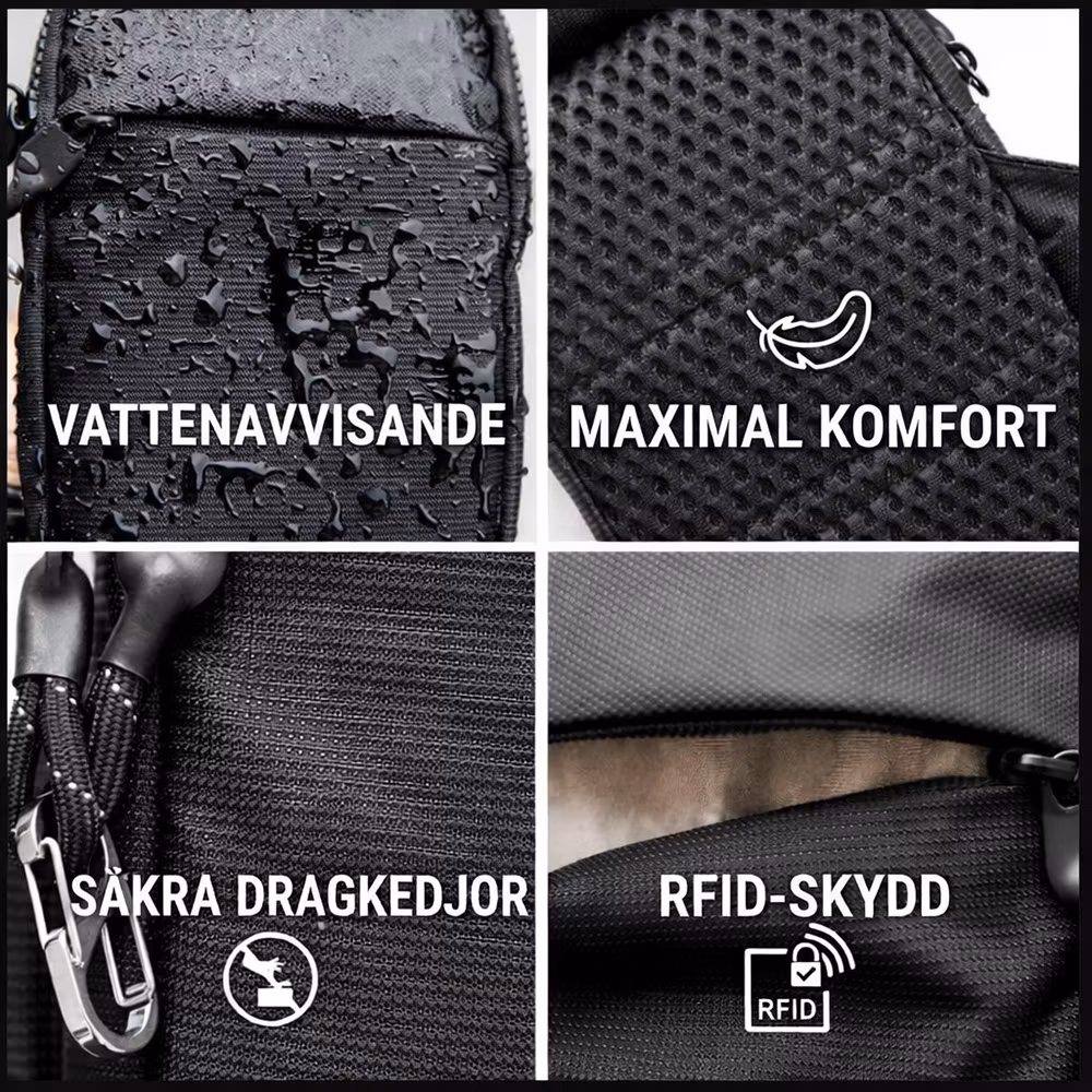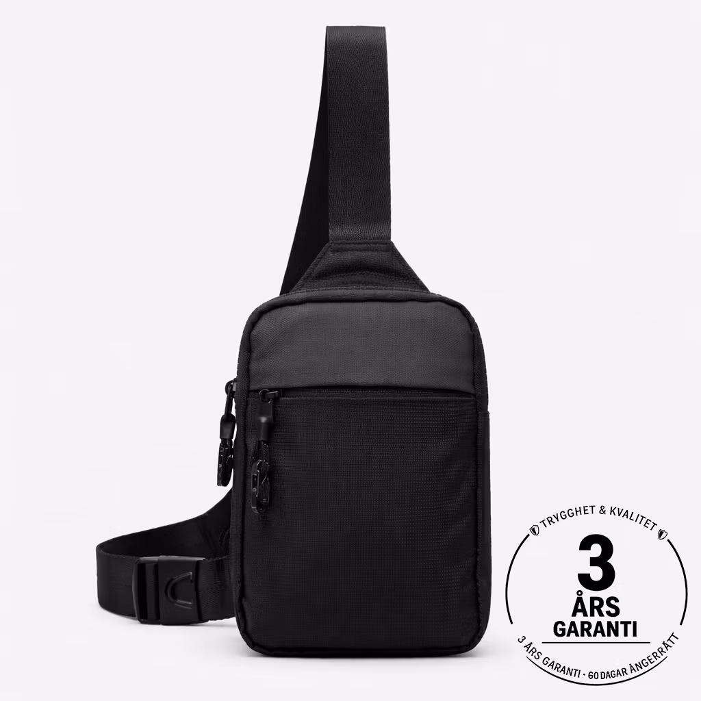 En kompakt och säker sling bag med stålförstärkt kabel i remmen som skyddar mot avskärning.